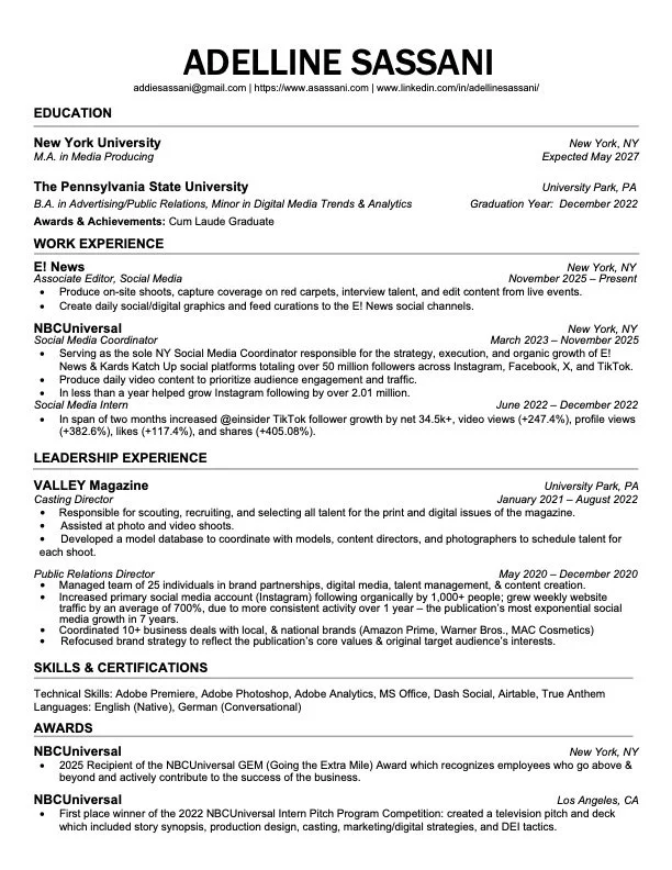 She lives in New York City where she currently works as a Associate Editor, Social Media for E! News where she covers live events such as the Tribeca Film Festival, MTV Awards, The Victoria’s Secret Fashion Show, and more. She is also responsible for creating daily social/digital content for the E! News social channels.